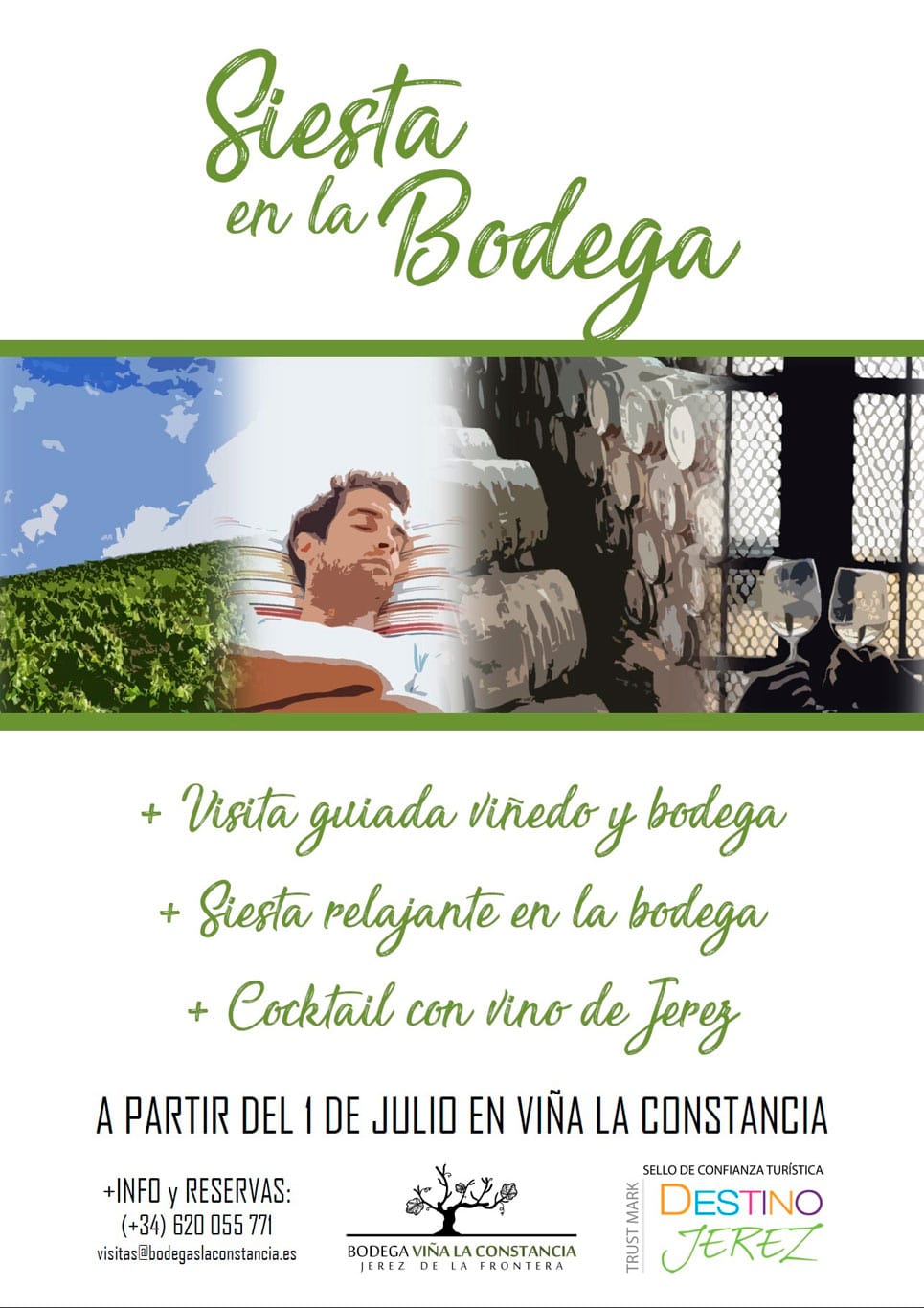 La actividad arranca el próximo 1 de julio y se llevará a cabo durante los meses de julio y agosto. ‘Siesta en la Bodega’ se desarrollará de lunes a domingo, entre las 14:00 y las 18:00 horas. Las plazas son limitadas y es necesario reservar con antelación. Para más información y reservas, pueden ponerse en contacto con Bodega Viña La Constancia en el teléfono: 620 055 771 o a través del email: visitas @ bodegaslaconstancia.es